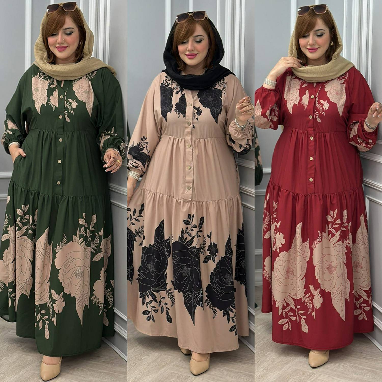 مانتو پیراهن عبایی برگی فری سایز۳۸تا۵۲