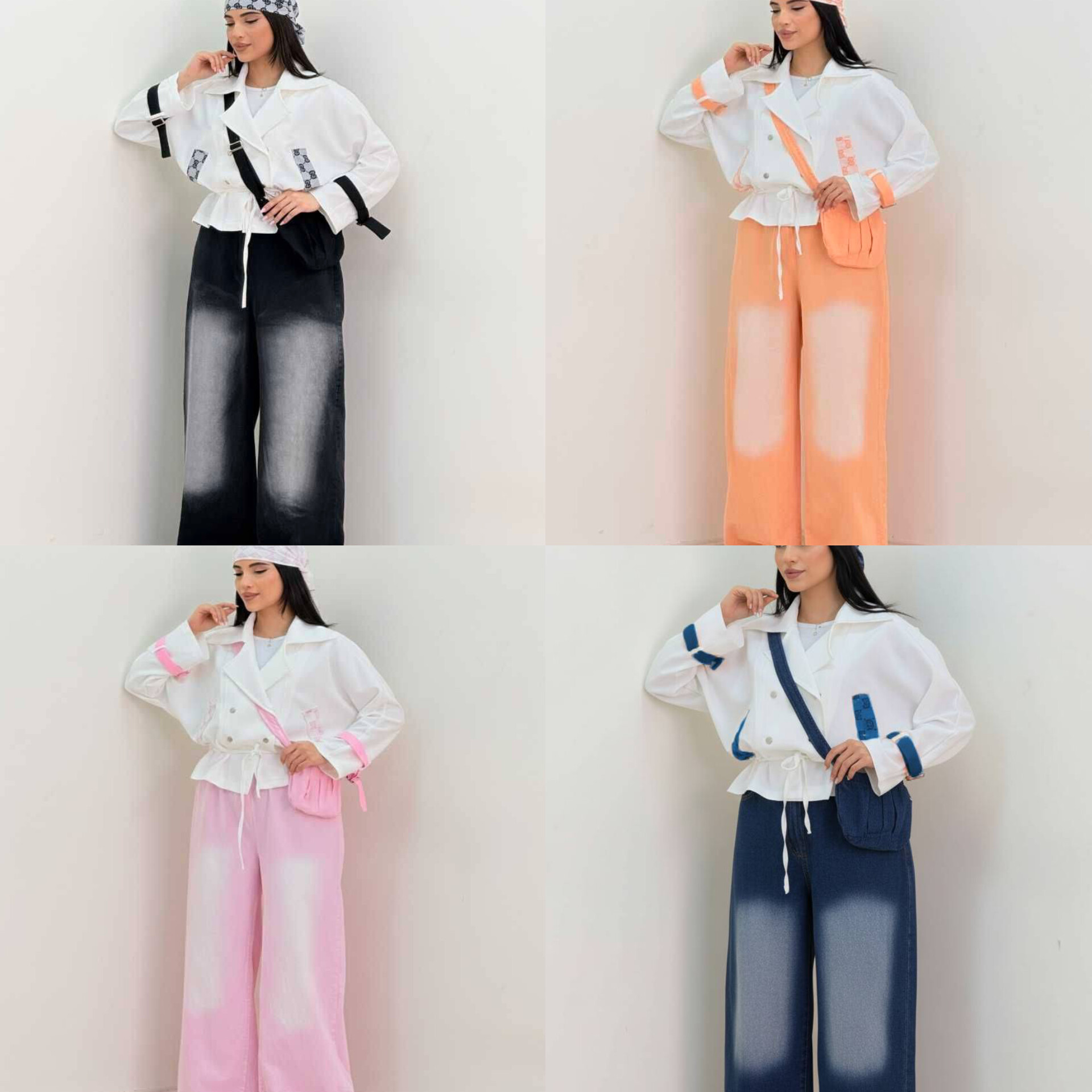 ست ۴تیکه شومیز مانتو عروسکی،شلوار،کیف و مینی اسکارف فری سایز تا۴۶ در۴رنگ جذاب