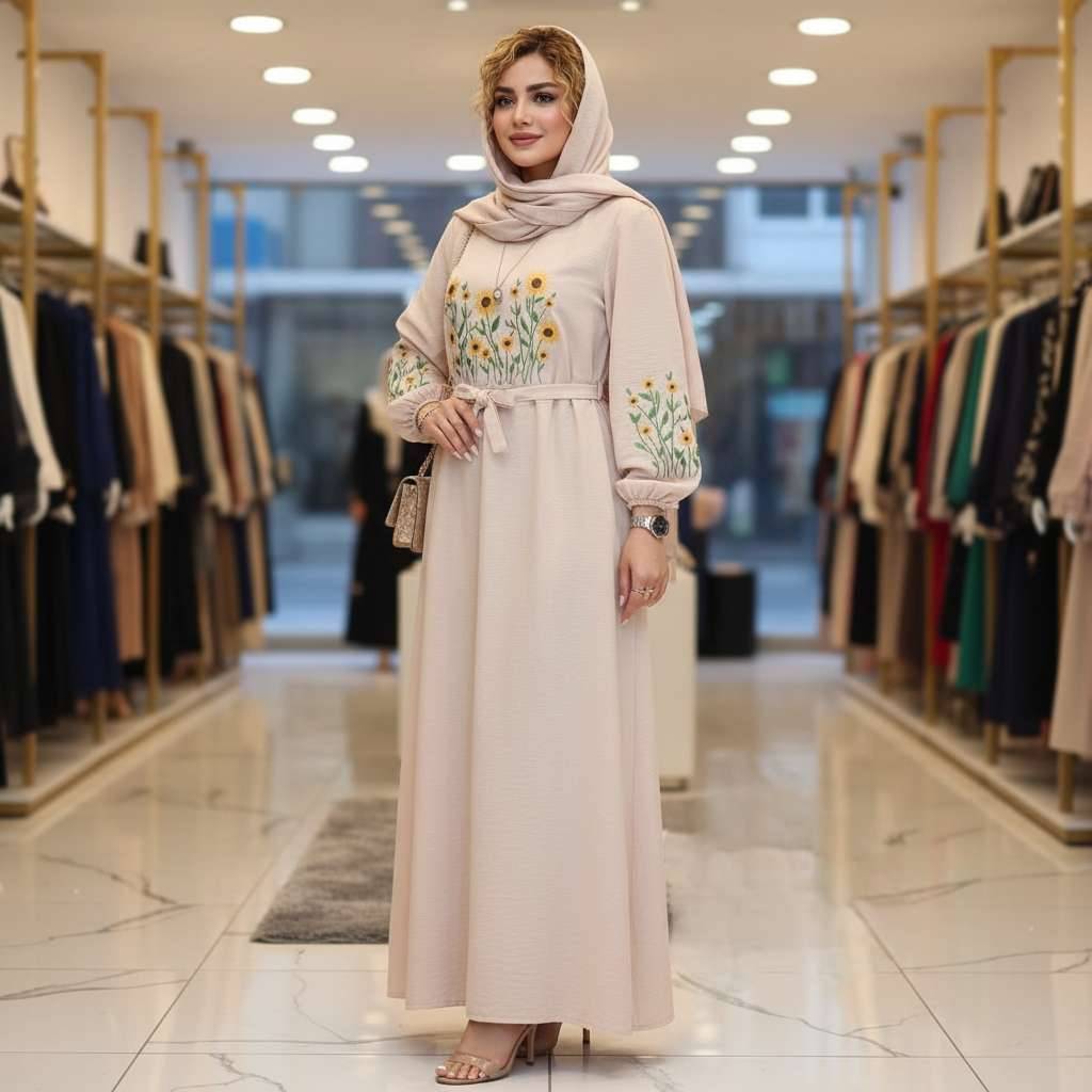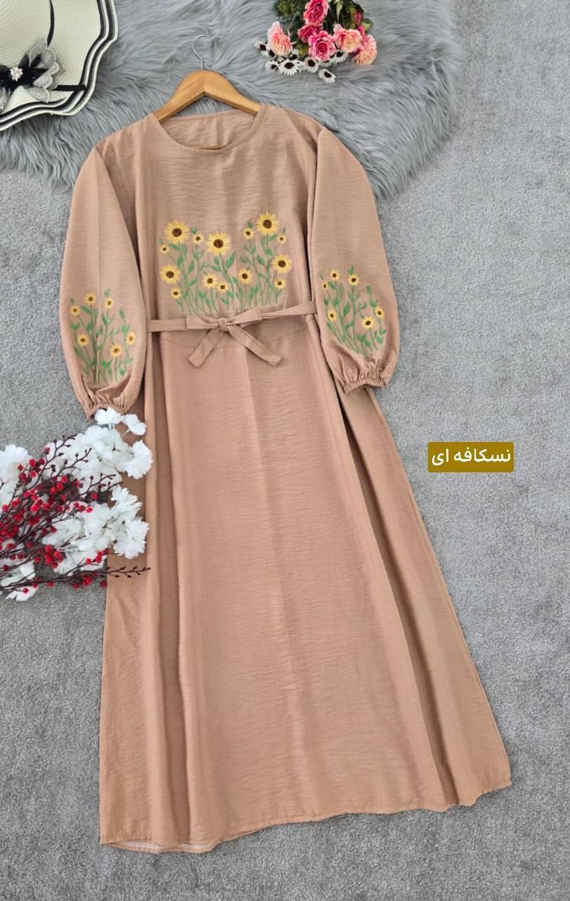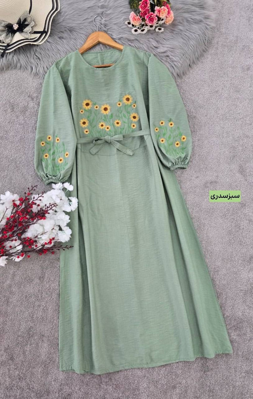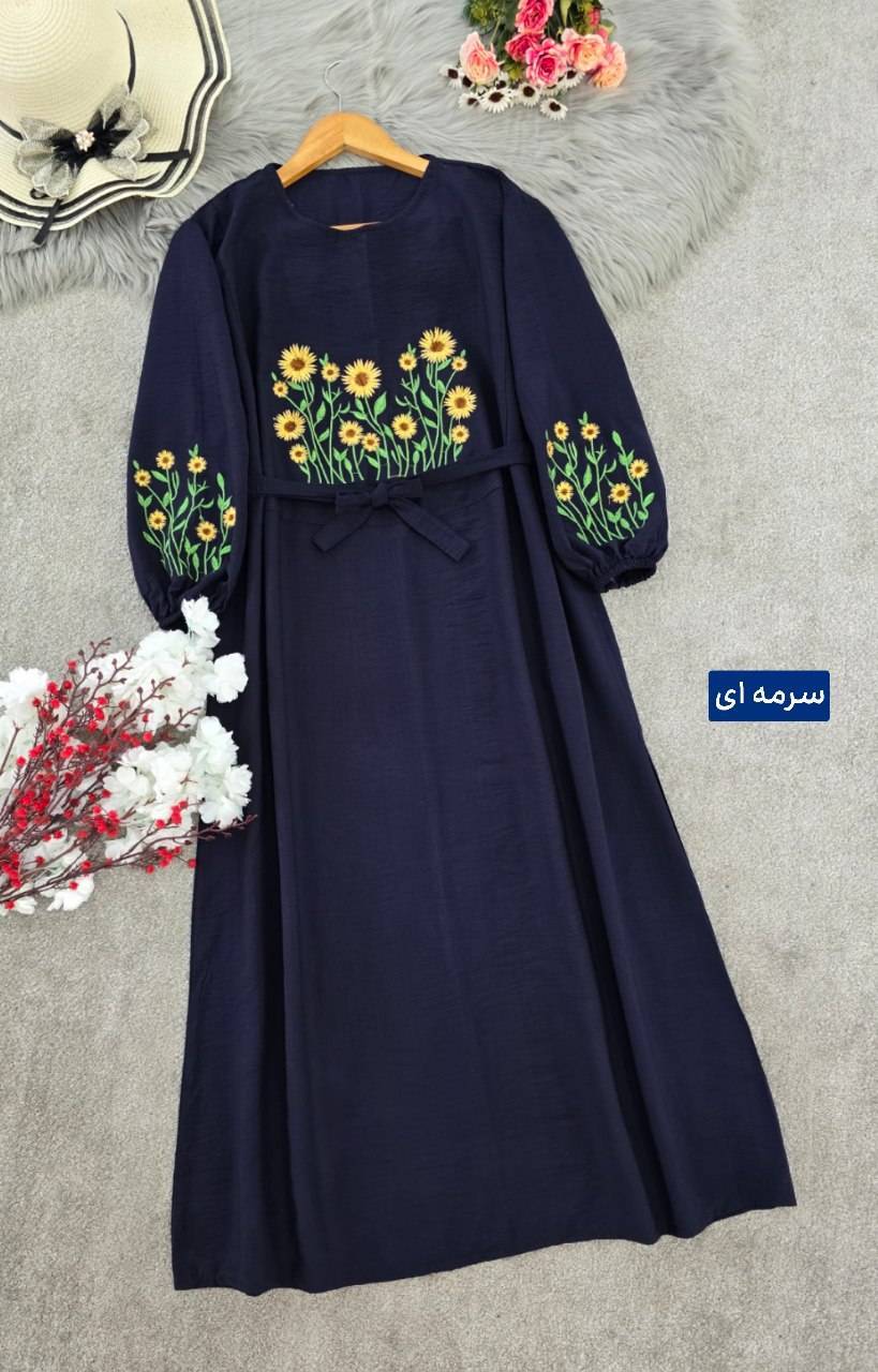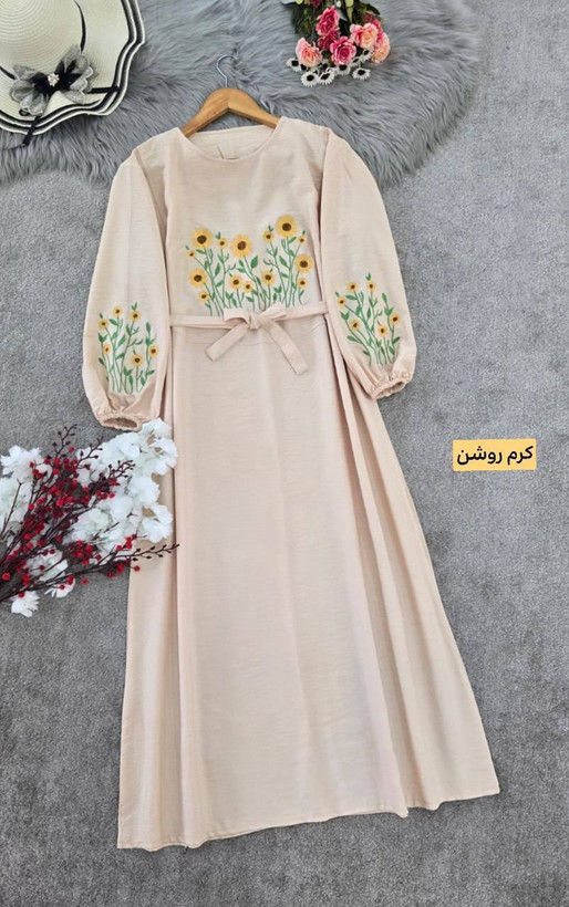 قد 125 دور سینه 120 فری سایز (40_50) قد آستین از یقه 63 دوربازو 42 دور باسن 136 دور مچ کش دمپا پایین کار 154 گلدوزی شده✅ کمربند از جنس خودش متصل✅