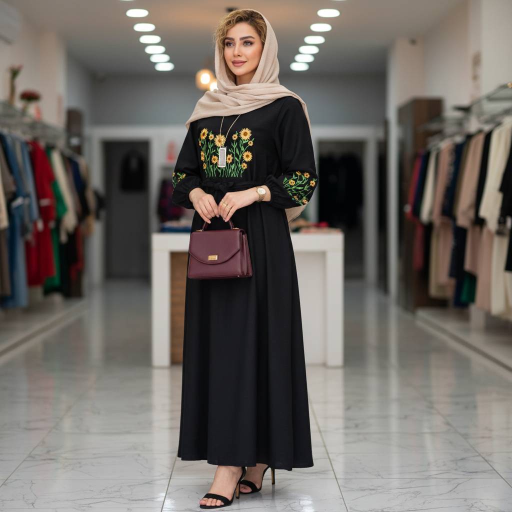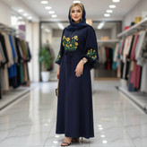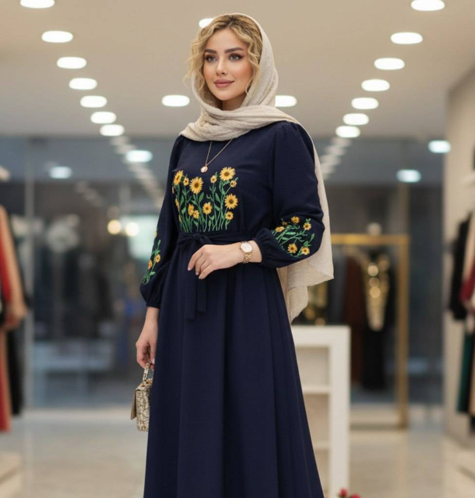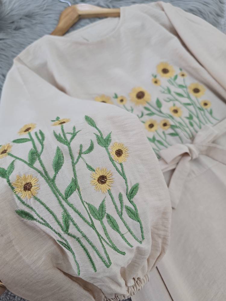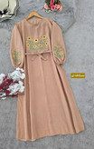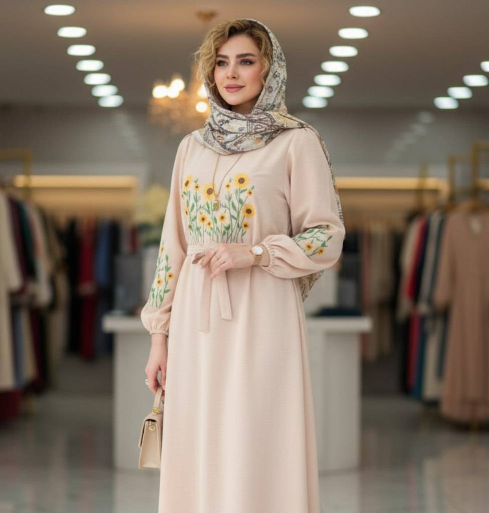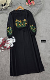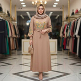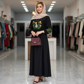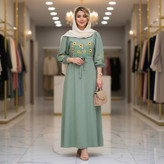 قد 125 دور سینه 120 فری سایز (40_50) قد آستین از یقه 63 دوربازو 42 دور باسن 136 دور مچ کش دمپا پایین کار 154 گلدوزی شده✅ کمربند از جنس خودش متصل✅