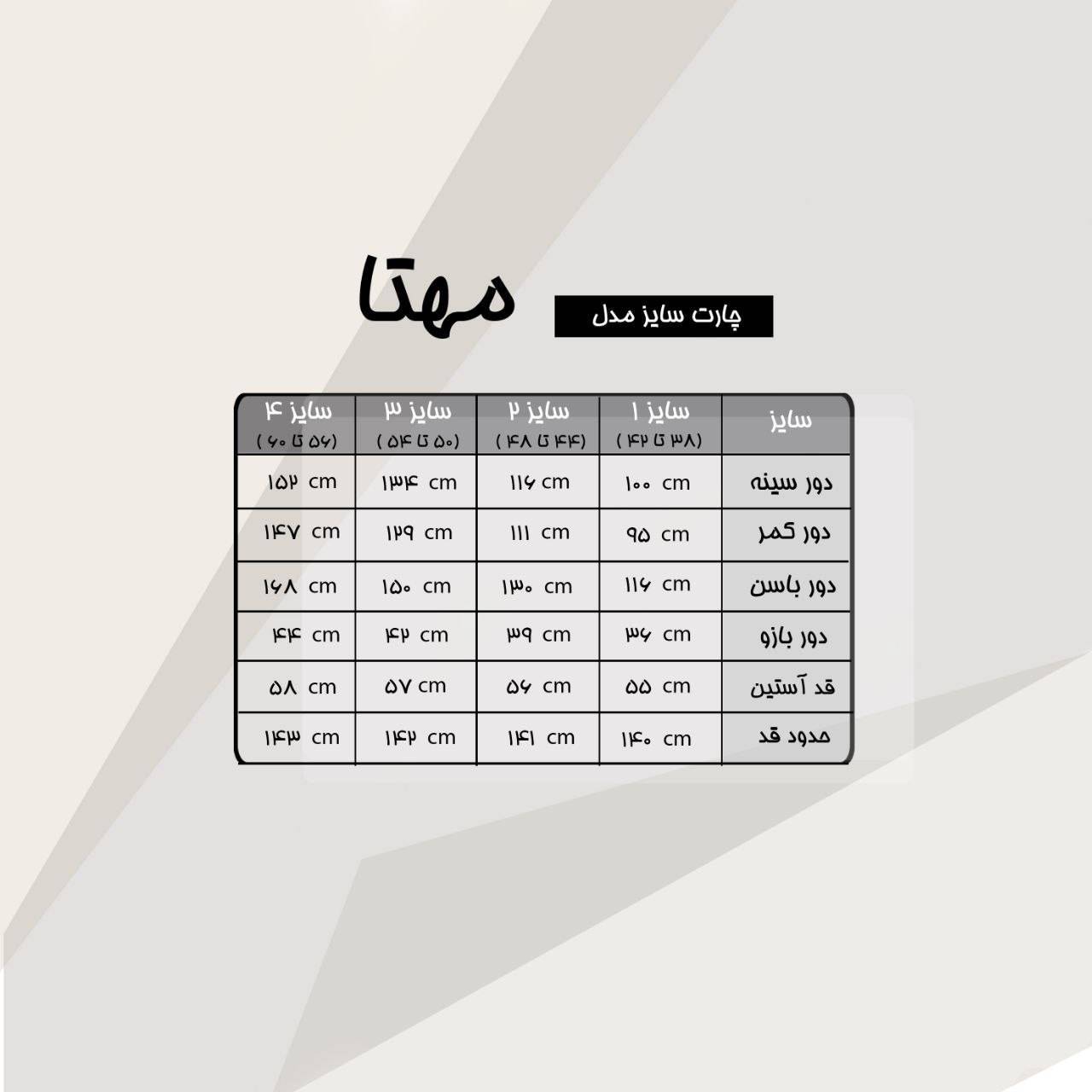 سایز ها : سایز 1 (38تا42), سایز 2 (44تا48), سایز 3 (50تا54), سایز 4 (56تا60)