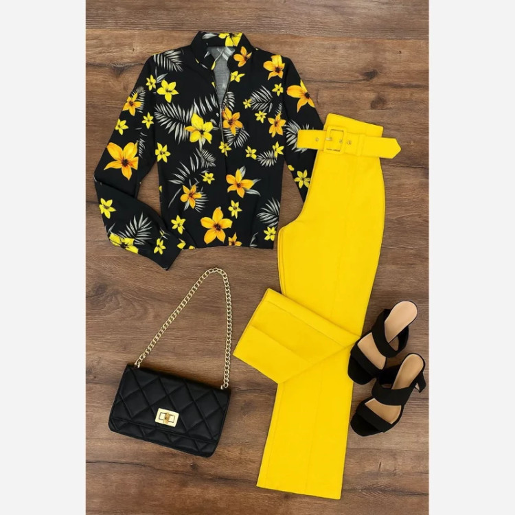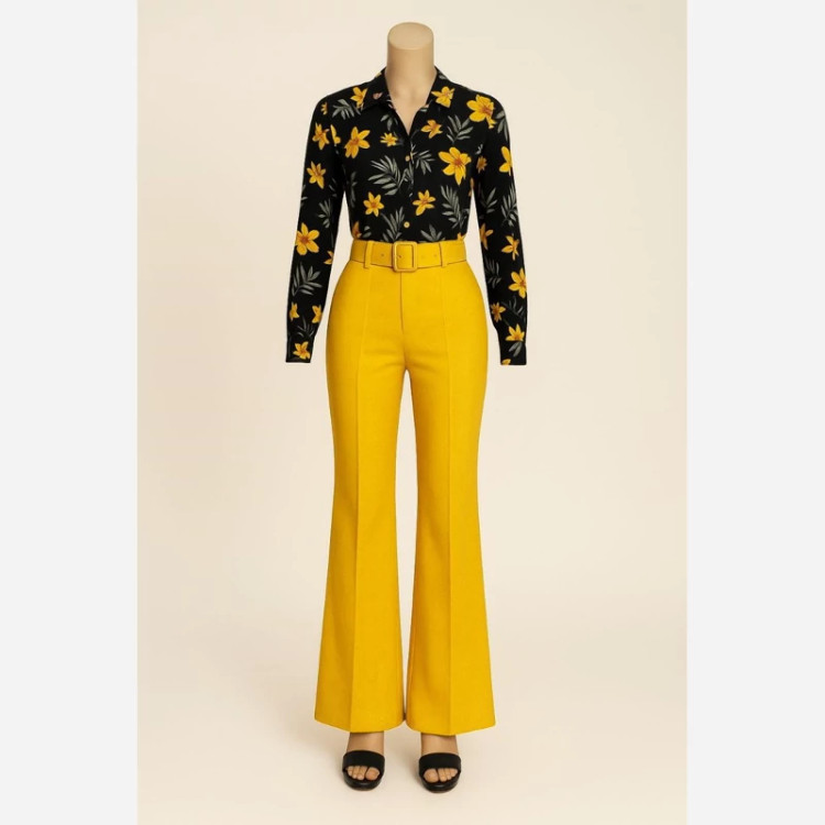 ست سه تیکه شومیز و شلوار و کمربند طرح گل زرد