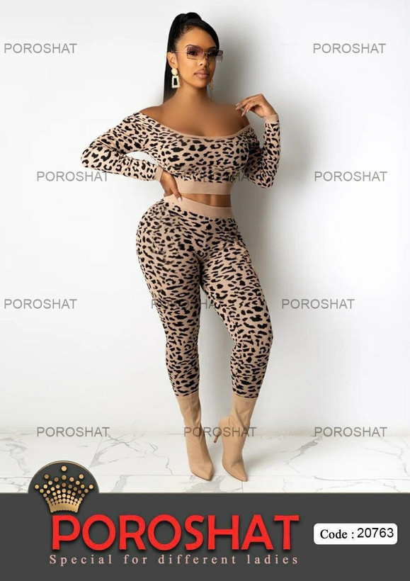 ست کراپ شلوار یقه قایقی پلنگی جذاب